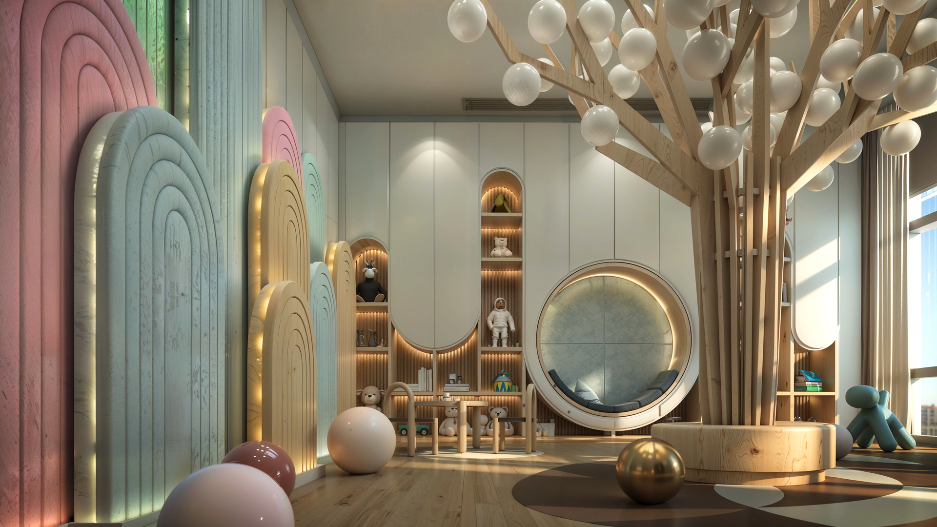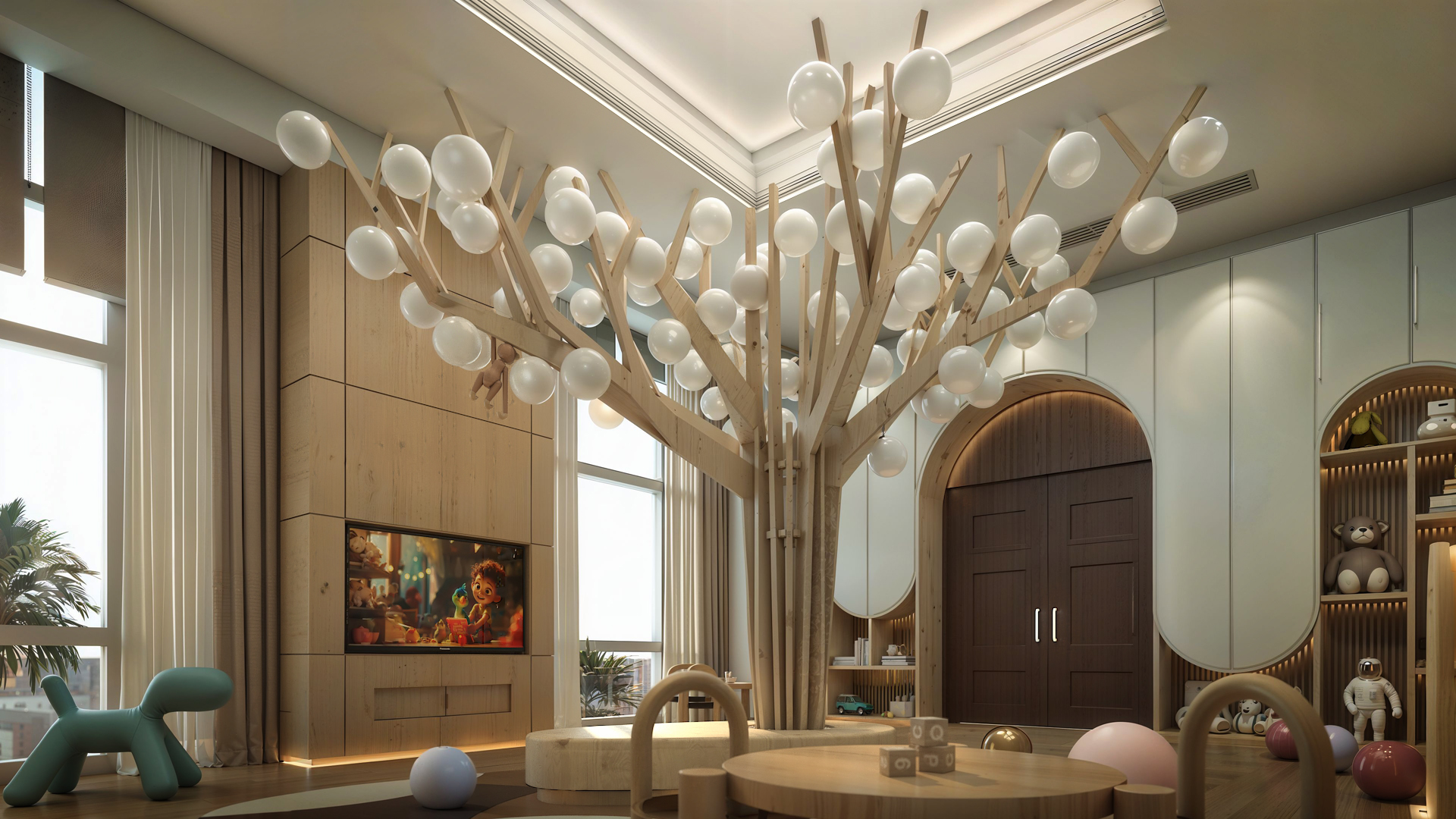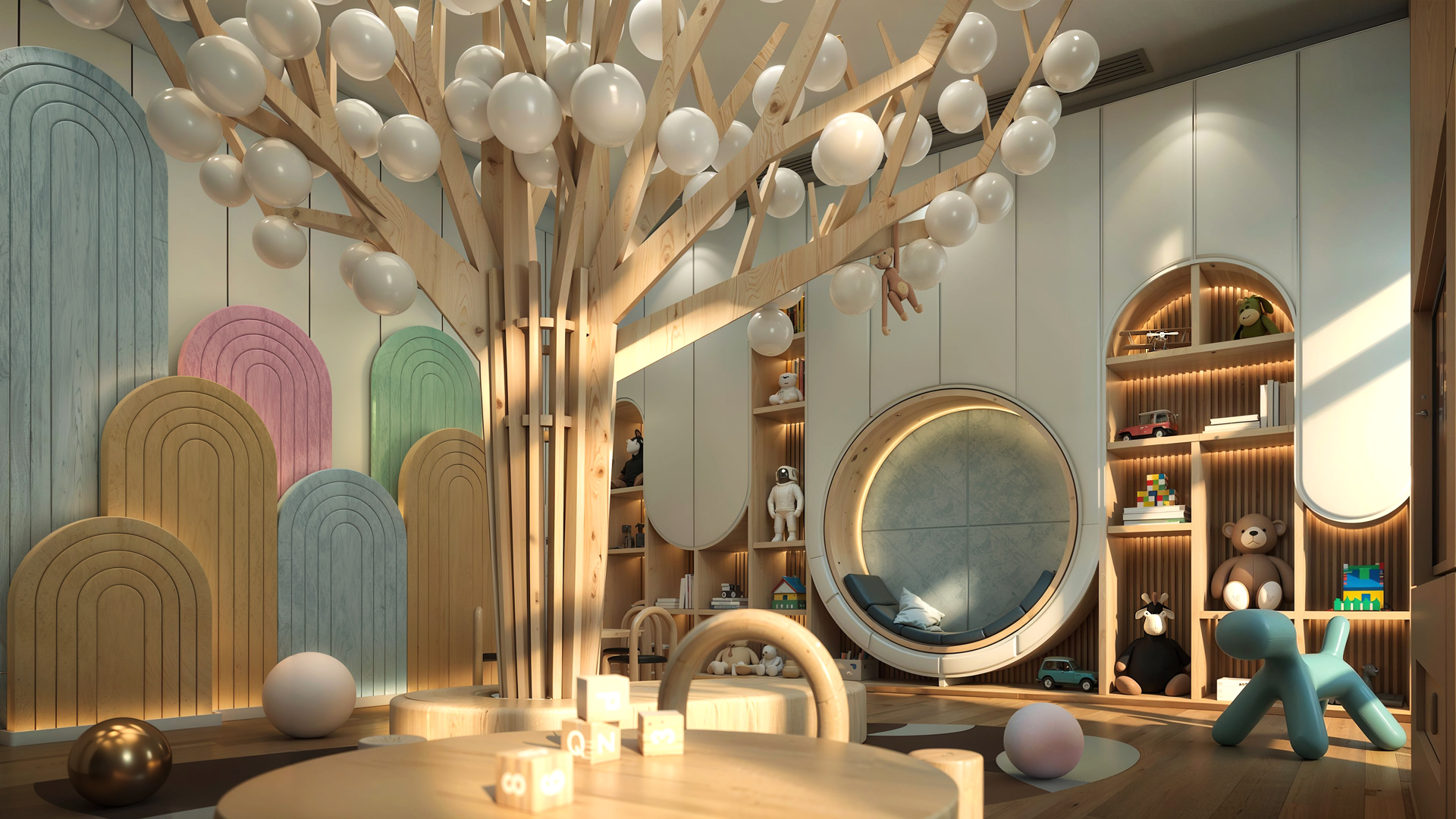 At the Four Seasons Kid Club, nature’s essence is transformed into an immersive, abstract landscape. Simplified natural forms and vibrant, saturated colors create an enchanting playground that sparks the imagination. Calm tones and natural light from large windows infuse the space with a serene, inviting atmosphere. This unique design offers children a whimsical sanctuary where they can dream, play, and grow in harmony with nature’s rhythm